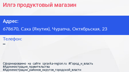 Илгэ, продуктовый магазин по адресу 678670, Саха (Якутия), Чурапча, Октябрьская, 23 в дальнейшем Организация, размещена в следующих категориях: