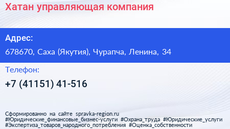 Хатан, управляющая компания по адресу 678670, Саха (Якутия), Чурапча, Ленина, 34 в дальнейшем Организация, размещена в следующих категориях: