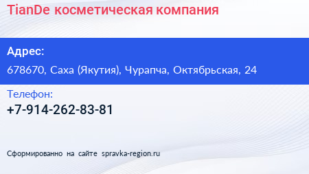 TianDe, косметическая компания по адресу 678670, Саха (Якутия), Чурапча, Октябрьская, 24 в дальнейшем Организация, размещена в следующих категориях: