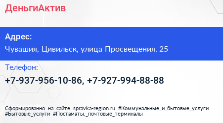 ДеньгиАктив по адресу Чувашия, Цивильск, улица Просвещения, 25 в дальнейшем Организация, размещена в следующих категориях: