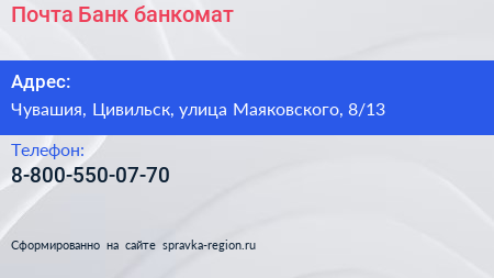 Почта Банк, банкомат по адресу Чувашия, Цивильск, улица Маяковского, 8/13 в дальнейшем Организация, размещена в следующих категориях: