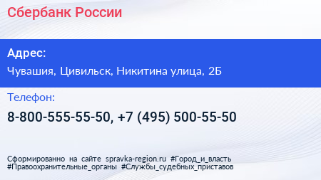 Сбербанк России по адресу Чувашия, Цивильск, Никитина улица, 2Б в дальнейшем Организация, размещена в следующих категориях:
