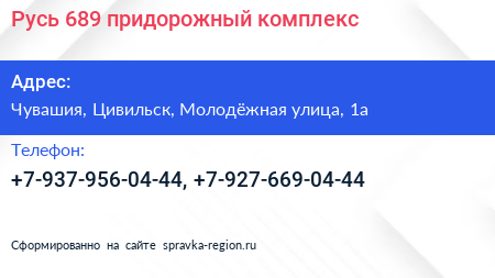 Русь 689, придорожный комплекс по адресу Чувашия, Цивильск, Молодёжная улица, 1а в дальнейшем Организация, размещена в следующих категориях: