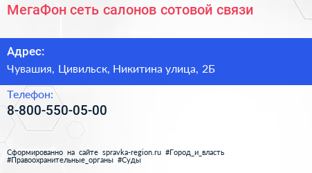 МегаФон, сеть салонов сотовой связи по адресу Чувашия, Цивильск, Никитина улица, 2Б в дальнейшем Организация, размещена в следующих категориях:
