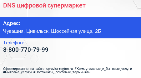 DNS, цифровой супермаркет по адресу Чувашия, Цивильск, Шоссейная улица, 2Б в дальнейшем Организация, размещена в следующих категориях: