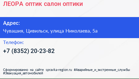 ЛЕОРА оптик, салон оптики по адресу Чувашия, Цивильск, улица Николаева, 5а в дальнейшем Организация, размещена в следующих категориях: