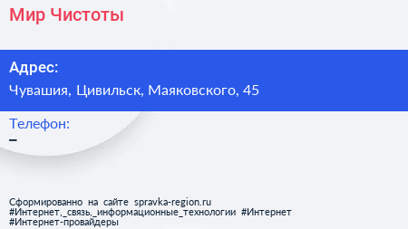 Мир Чистоты по адресу Чувашия, Цивильск, Маяковского, 45 в дальнейшем Организация, размещена в следующих категориях: