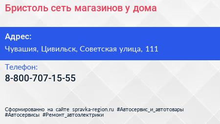 Бристоль, сеть магазинов у дома по адресу Чувашия, Цивильск, Советская улица, 111 в дальнейшем Организация, размещена в следующих категориях: