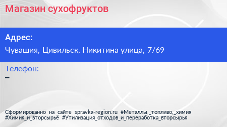 Магазин сухофруктов по адресу Чувашия, Цивильск, Никитина улица, 7/69 в дальнейшем Организация, размещена в следующих категориях: