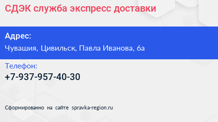 СДЭК, служба экспресс-доставки по адресу Чувашия, Цивильск, Павла Иванова, 6а в дальнейшем Организация, размещена в следующих категориях: