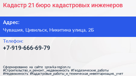 Кадастр 21, бюро кадастровых инженеров по адресу Чувашия, Цивильск, Никитина улица, 2Б в дальнейшем Организация, размещена в следующих категориях: