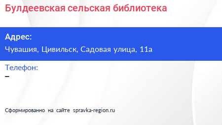 Булдеевская сельская библиотека по адресу Чувашия, Цивильск, Садовая улица, 11а в дальнейшем Организация, размещена в следующих категориях: