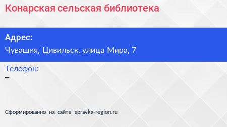 Конарская сельская библиотека по адресу Чувашия, Цивильск, улица Мира, 7 в дальнейшем Организация, размещена в следующих категориях: