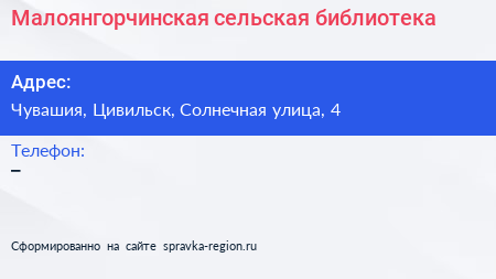 Малоянгорчинская сельская библиотека по адресу Чувашия, Цивильск, Солнечная улица, 4 в дальнейшем Организация, размещена в следующих категориях: