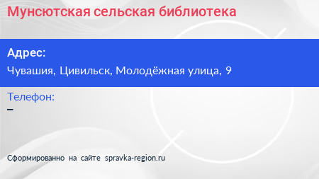 Мунсютская сельская библиотека по адресу Чувашия, Цивильск, Молодёжная улица, 9 в дальнейшем Организация, размещена в следующих категориях: