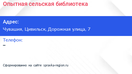 Опытная сельская библиотека по адресу Чувашия, Цивильск, Дорожная улица, 7 в дальнейшем Организация, размещена в следующих категориях: