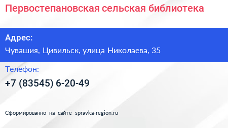 Первостепановская сельская библиотека по адресу Чувашия, Цивильск, улица Николаева, 35 в дальнейшем Организация, размещена в следующих категориях: