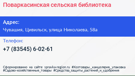 Поваркасинская сельская библиотека по адресу Чувашия, Цивильск, улица Николаева, 58а в дальнейшем Организация, размещена в следующих категориях: