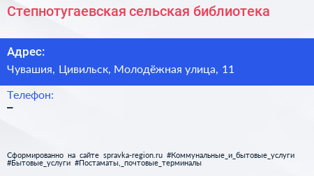 Степнотугаевская сельская библиотека по адресу Чувашия, Цивильск, Молодёжная улица, 11 в дальнейшем Организация, размещена в следующих категориях: