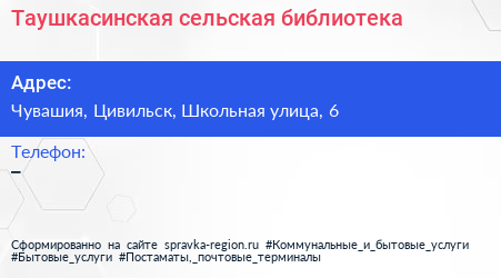 Таушкасинская сельская библиотека по адресу Чувашия, Цивильск, Школьная улица, 6 в дальнейшем Организация, размещена в следующих категориях: