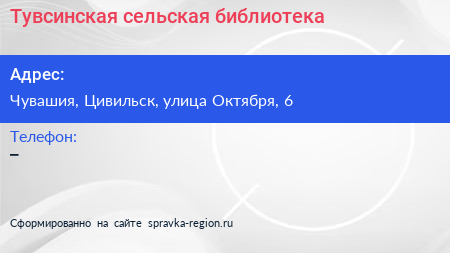 Тувсинская сельская библиотека по адресу Чувашия, Цивильск, улица Октября, 6 в дальнейшем Организация, размещена в следующих категориях: