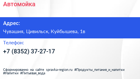 Автомойка по адресу Чувашия, Цивильск, Куйбышева, 1в в дальнейшем Организация, размещена в следующих категориях: