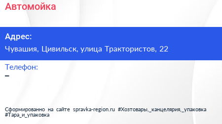 Автомойка по адресу Чувашия, Цивильск, улица Трактористов, 22 в дальнейшем Организация, размещена в следующих категориях: