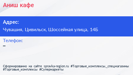 Аниш, кафе по адресу Чувашия, Цивильск, Шоссейная улица, 14Б в дальнейшем Организация, размещена в следующих категориях: