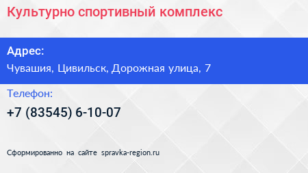 Культурно-спортивный комплекс по адресу Чувашия, Цивильск, Дорожная улица, 7 в дальнейшем Организация, размещена в следующих категориях: