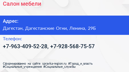 Салон мебели по адресу Дагестан, Дагестанские Огни, Ленина, 29Б в дальнейшем Организация, размещена в следующих категориях: