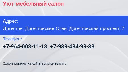 Уют, мебельный салон по адресу Дагестан, Дагестанские Огни, Дагестанский проспект, 7 в дальнейшем Организация, размещена в следующих категориях: