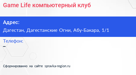 Game Life, компьютерный клуб по адресу Дагестан, Дагестанские Огни, Абу-Бакара, 1/1 в дальнейшем Организация, размещена в следующих категориях: