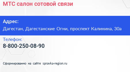 МТС, салон сотовой связи по адресу Дагестан, Дагестанские Огни, проспект Калинина, 30а в дальнейшем Организация, размещена в следующих категориях: