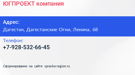 ЮГПРОЕКТ, компания по адресу Дагестан, Дагестанские Огни, Ленина, 68 в дальнейшем Организация, размещена в следующих категориях: