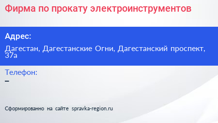 Фирма по прокату электроинструментов по адресу Дагестан, Дагестанские Огни, Дагестанский проспект, 37а в дальнейшем Организация, размещена в следующих категориях: