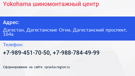 Yokohama, шиномонтажный центр по адресу Дагестан, Дагестанские Огни, Дагестанский проспект, 164а в дальнейшем Организация, размещена в следующих категориях: