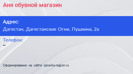 Аня, обувной магазин по адресу Дагестан, Дагестанские Огни, Пушкина, 2а в дальнейшем Организация, размещена в следующих категориях:
