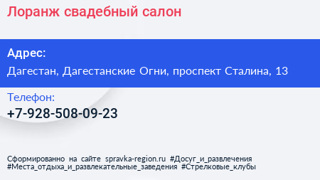 Лоранж, свадебный салон по адресу Дагестан, Дагестанские Огни, проспект Сталина, 13 в дальнейшем Организация, размещена в следующих категориях: