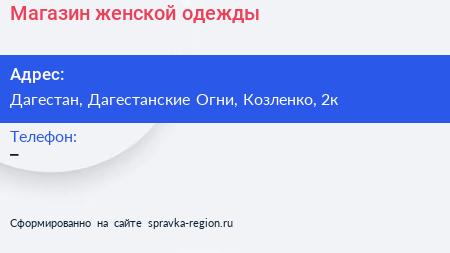 Магазин женской одежды по адресу Дагестан, Дагестанские Огни, Козленко, 2к в дальнейшем Организация, размещена в следующих категориях: