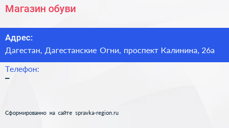 Магазин обуви по адресу Дагестан, Дагестанские Огни, проспект Калинина, 26а в дальнейшем Организация, размещена в следующих категориях: