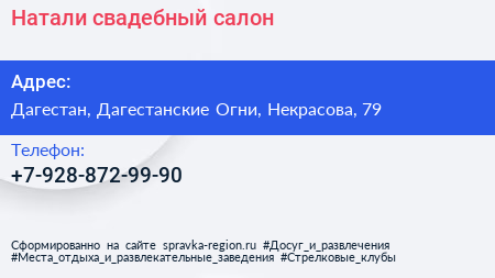 Натали, свадебный салон по адресу Дагестан, Дагестанские Огни, Некрасова, 79 в дальнейшем Организация, размещена в следующих категориях: