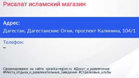 Рисалат, исламский магазин по адресу Дагестан, Дагестанские Огни, проспект Калинина, 104/1 в дальнейшем Организация, размещена в следующих категориях: