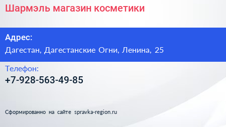 Шармэль, магазин косметики по адресу Дагестан, Дагестанские Огни, Ленина, 25 в дальнейшем Организация, размещена в следующих категориях: