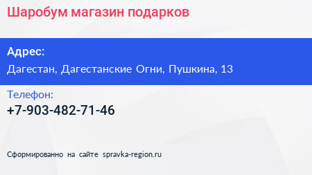 Шаробум, магазин подарков по адресу Дагестан, Дагестанские Огни, Пушкина, 13 в дальнейшем Организация, размещена в следующих категориях: