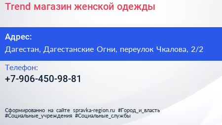 Trend, магазин женской одежды по адресу Дагестан, Дагестанские Огни, переулок Чкалова, 2/2 в дальнейшем Организация, размещена в следующих категориях: