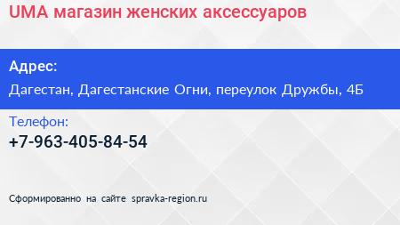 UMA, магазин женских аксессуаров по адресу Дагестан, Дагестанские Огни, переулок Дружбы, 4Б в дальнейшем Организация, размещена в следующих категориях: