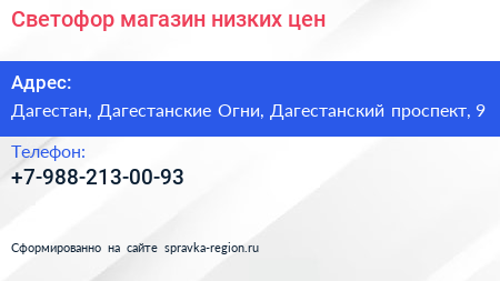 Светофор, магазин низких цен по адресу Дагестан, Дагестанские Огни, Дагестанский проспект, 9 в дальнейшем Организация, размещена в следующих категориях: