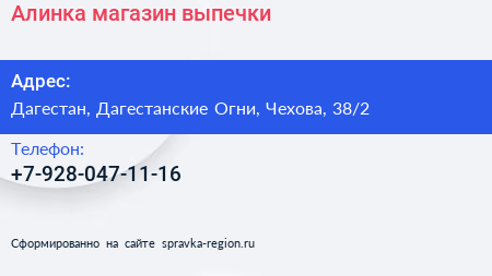 Алинка, магазин выпечки по адресу Дагестан, Дагестанские Огни, Чехова, 38/2 в дальнейшем Организация, размещена в следующих категориях: