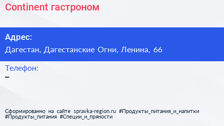 Continent, гастроном по адресу Дагестан, Дагестанские Огни, Ленина, 66 в дальнейшем Организация, размещена в следующих категориях: