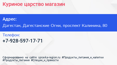 Куриное царство, магазин по адресу Дагестан, Дагестанские Огни, проспект Калинина, 80 в дальнейшем Организация, размещена в следующих категориях: